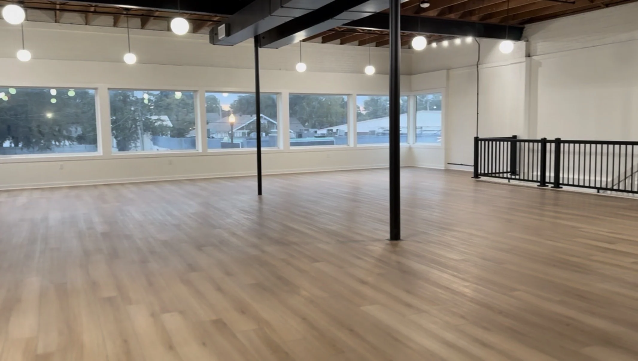 The two-story sophisticated venue stands out with it’s unique design, 11ft ceilings, and expansive front windows that showcase panoramic views of a bustling city street and the historic Ouachita River bridge. It is strategically located in the heart of Monroe; bathed in natural light, this space seamlessly blends modern elegance with urban charm, providing the perfect backdrop for memorable gatherings. It is easily accessible from major roads and highways, access to private parking lots from four different streets and ample parking space for guests. The venue offers a 2,500 SqFt 1st floor and an additional upstairs 2,600 SqFt open space, featuring modern amenities and a stylish, customizable layout to suit various event needs. The venue is equipped with state-of-the-art lighting systems. The taller ceilings offer more flexibility in terms of interior design and layout. Taller ceilings also can help improve acoustics enhancing the overall experience for attendees and performers alike.